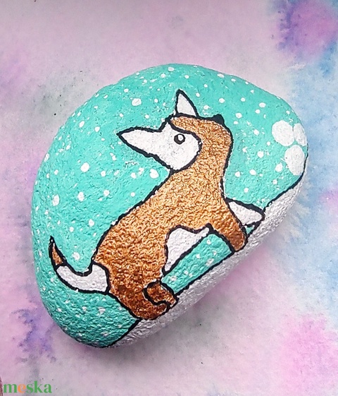 Kézzel festett kutyus kavics - kiskutya kő - kutya, havazás, hógolyó