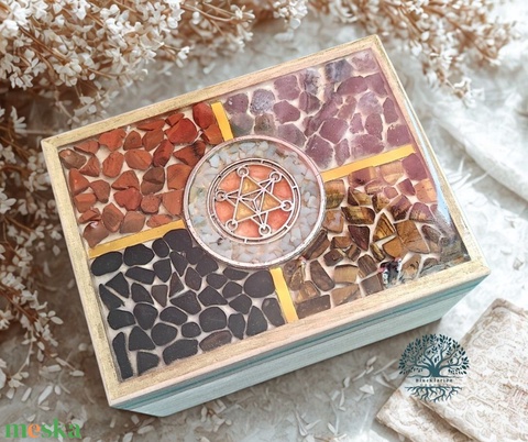 Orgonit doboz amazonit, vörös jáspis, fekete turmalin, tigrisszem, mohaachát ásványokkal.