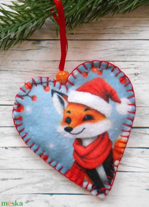 Cuki, mosolygós róka mintás szív alakú karácsonyfadísz II.