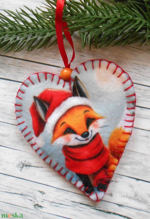 Cuki, mosolygós róka mintás szív alakú karácsonyfadísz IV.
