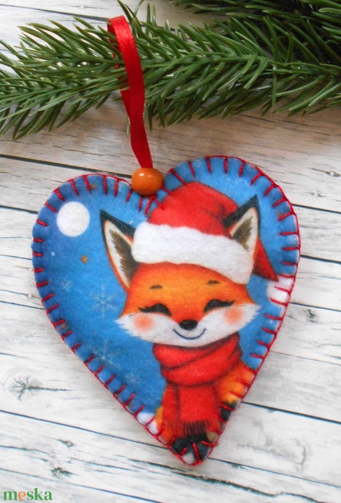 Cuki, mosolygós róka mintás szív alakú karácsonyfadísz V.