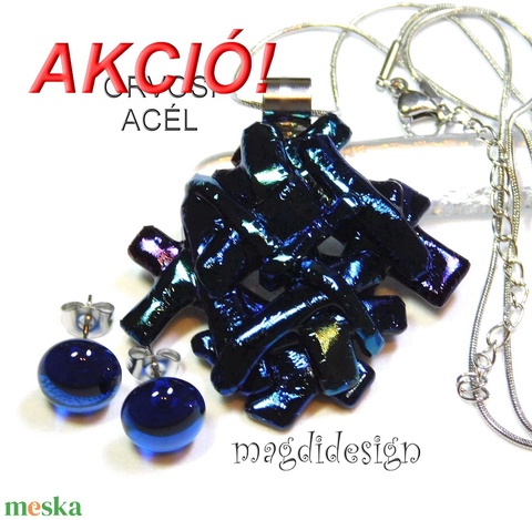 Türkizes kék borzaska eozin üvegékszer szett, nyaklánc, pötty fülbevaló