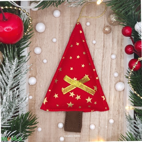 Karácsonyfa függő, textil fenyőfa, piros arany csillagos
