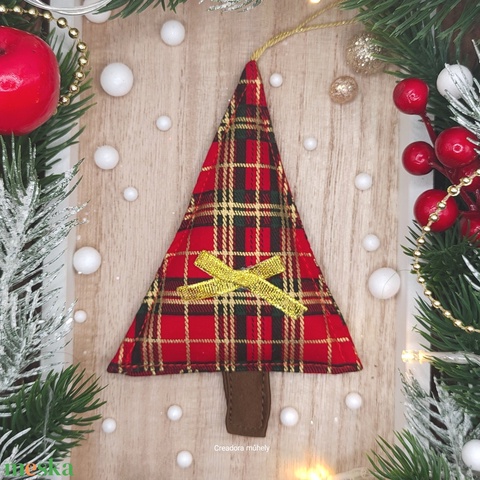 Karácsonyfa függő dísz, textil fenyőfa piros-arany kockás
