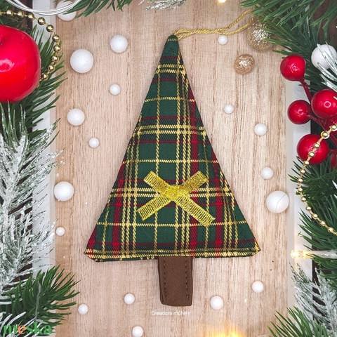 Karácsonyfa függő dísz, textil fenyőfa zöld-arany kockás