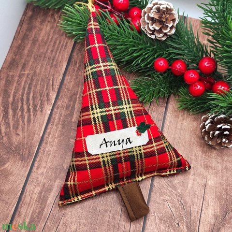 Névre szóló textil fenyőfa, karácsonyfa piros-arany kockás