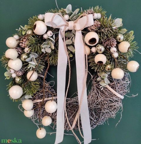 - Anyaga: vesszőalap, műzöld, toboz, bogyók, üveggömb, bársonyszalag