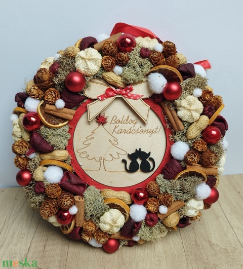 - Anyaga: mohakoszorú, fatábla, száraz termések, gömbök