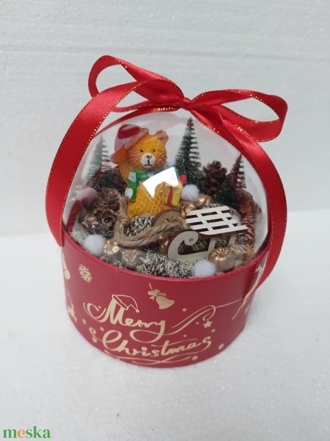 - Anyaga: papír/karton doboz, műanyag bura, szalag, műgyanta figura, fa szánkó, zuzmó, mű fenyőfa, száraz termések