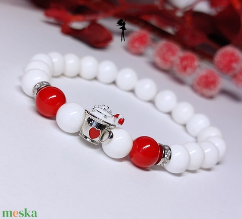 "Habos kávé" ünnepi, téli karkötő fehér kagylógyöngyből, piros jádéból, strasszos dísszel