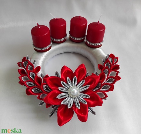 - Anyaga: szaténszalag, hungarocell karika, gyöngy, gyertya