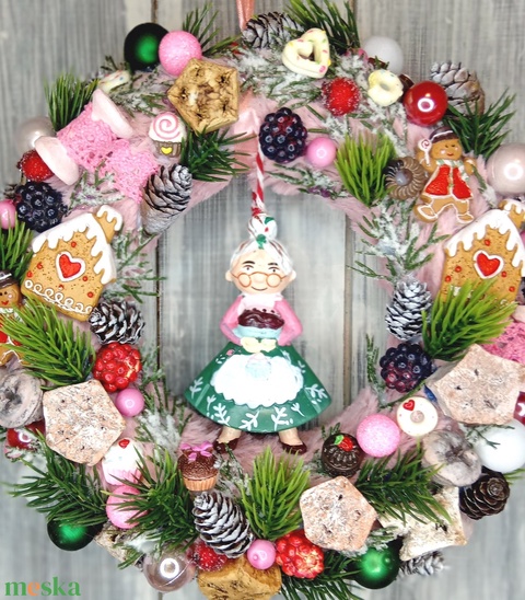 - Anyaga: szalma alap, szőrme, díszek, mű gyümölcs, fenyőág, süti dekoráció, mézeskalács figura