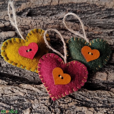 Színes szívek - hímzett gyapjúfilc karácsonyfadísz, ajándék kísérő, kulcstartó, táska dísz