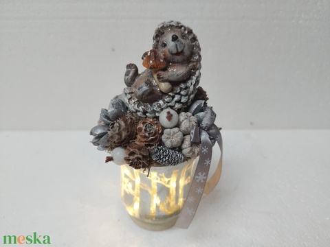 - Anyaga: selyemszalag, száraz termés, kerámia süni, selyem szalag, zuzmó, üveg kaspó