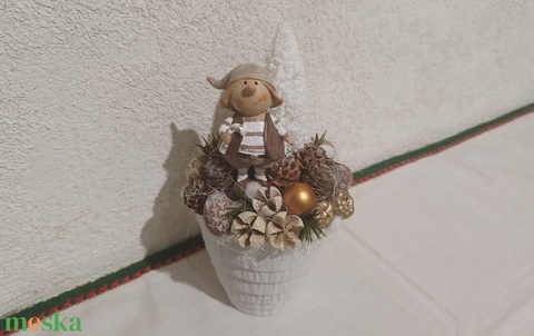 - Anyaga: műanyag kaspó, kerámia figura, száraz termések, gömb, mű fenyő
