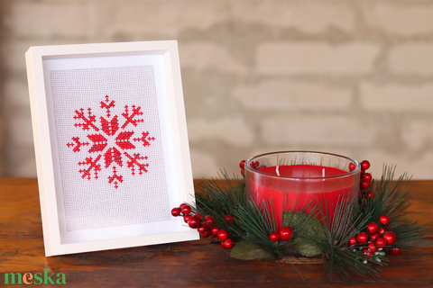 karácsony, karácsonyi ajándékozás, karácsonyi képeslap, üdvözlőlap, ajándékkísérő, kézihímzés, hópehely, piros, egyedi, tartós, télivarázslat, keresztszemes, képkeret, kép, képeslap, kártya, ajándék, téli, hímzett