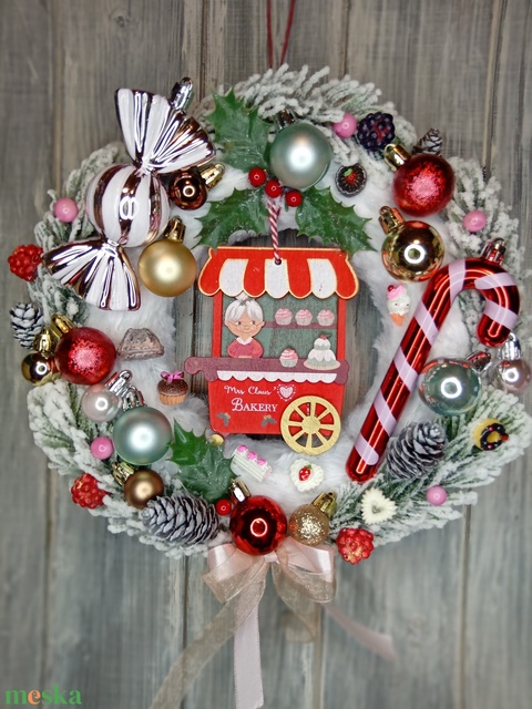 - Anyaga: szalma alap, műszőrme, fa dekoráció, műfenyő, mű édesség, díszek, toboz termés