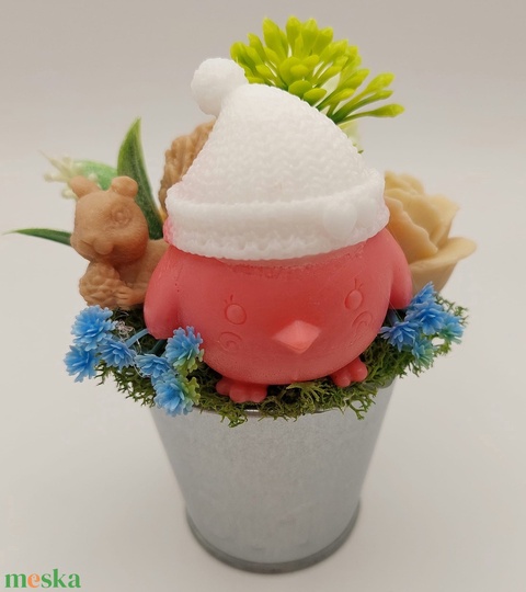 Kis fém kaspó szappanvirágokkal és szappanfigurákkal