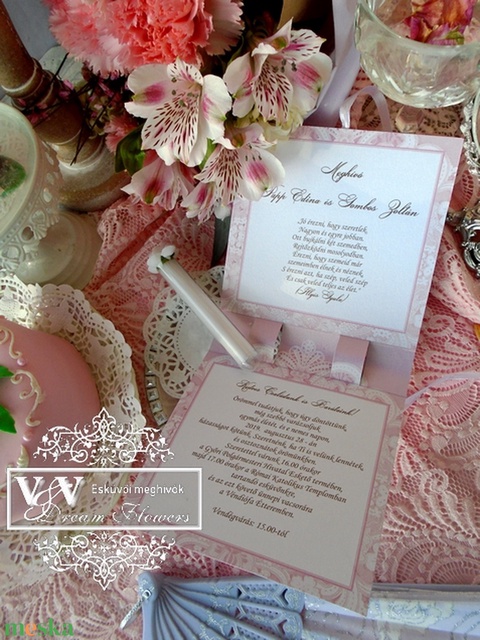 * MEGHÍVÓ jellemzői: Csillogó gyöngyházas fényű kartonból készített rózsaszín-fehér esküvői meghívó, benne üveg kémcső, amiben kis papír található - erre verset, nászajándék ötlet versikét vagy más fontos információ írható. Fehér szatén szalag díszíti, az üvegcsét fehér kis polifoam rózsa zárja le.