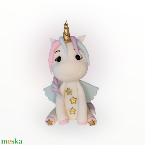 Kézműves fondant unikornis cukorfigura kék szárnyakkal – nagy méretű tortadísz gyerekeknek