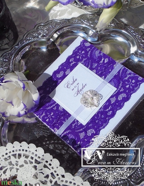 Esküvői meghívó sötétlila csipkével nászajándék ötlet kártyával és ezüst virág bross dísszel