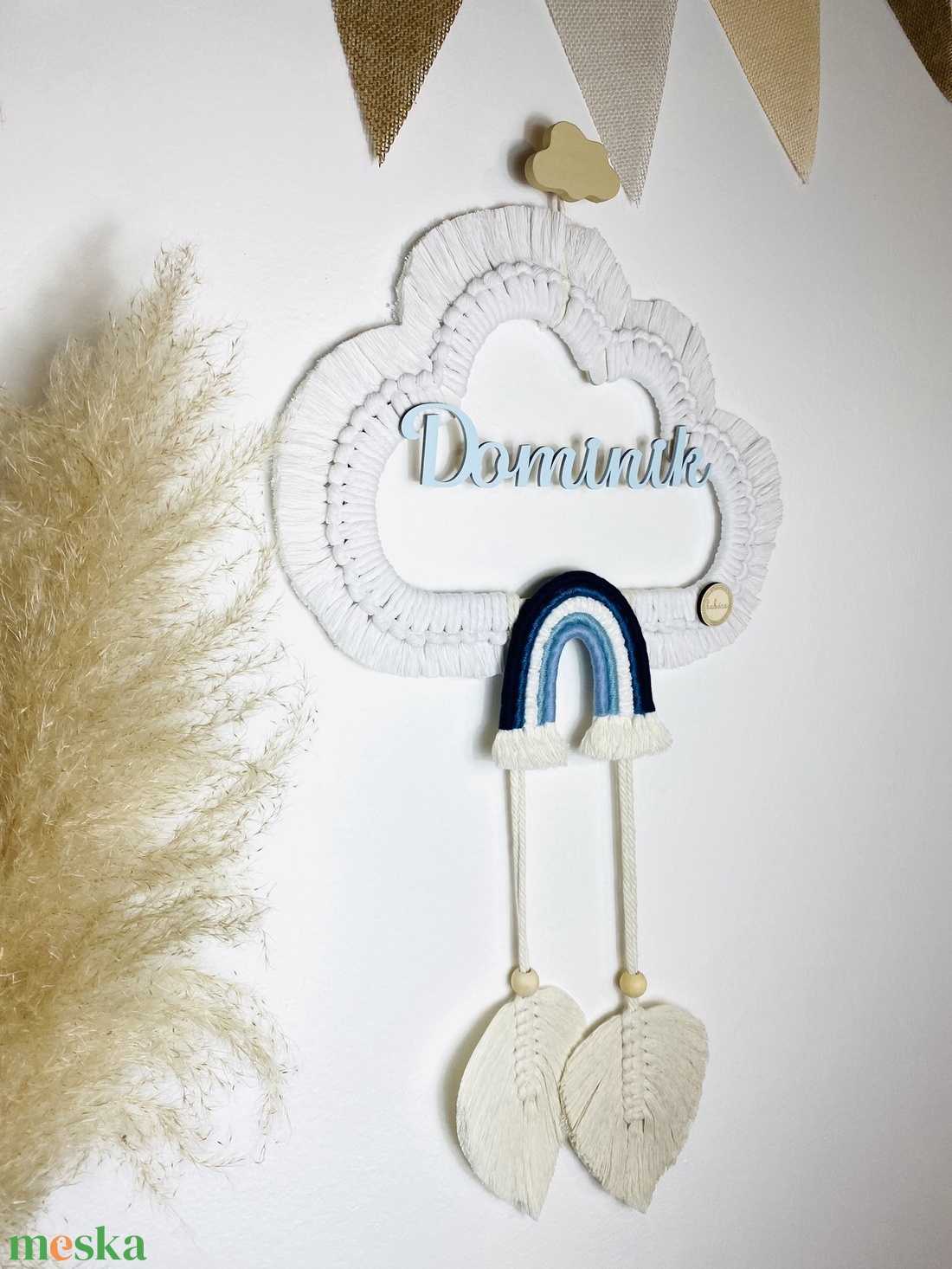 Névre szóló makramé felhő, szivárvánnyal és levelekkel falidekoráció (kicsi) - fiús