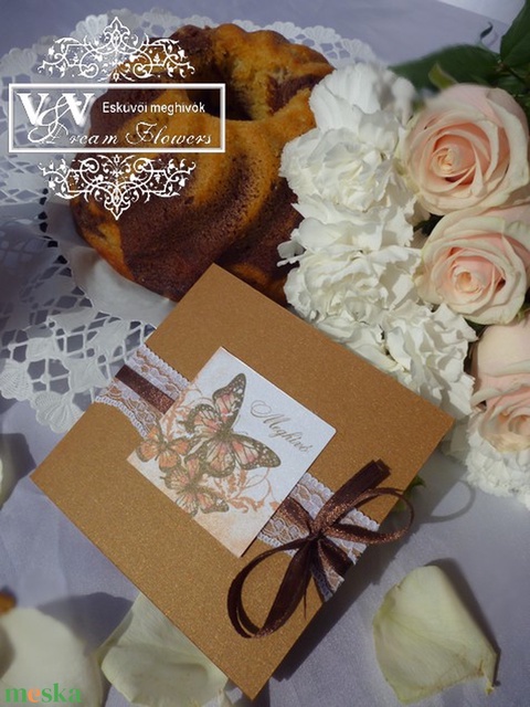 * MEGHÍVÓ jellemzői: Csillogó réz színű metál és fehér gyöngyházfényű kartonból készített csipkés meghívó kivehető betétlappal és nászajándék ötlet kártyával.