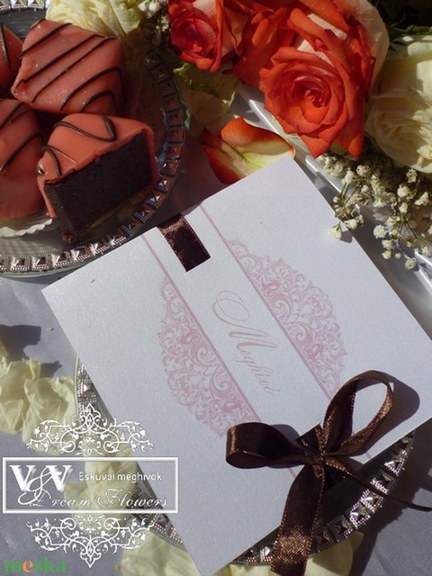 * MEGHÍVÓ jellemzői: Csillogó gyöngyházfényű kartonból készített esküvői meghívó 3 kivehető kártyával, melyek közül az egyik nászajándék ötlet kártya. Barna szalag díszíti de bármilyen más színű is rendelhető hozzá