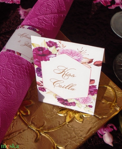 Esküvői ültetőkártya magenta rózsákkal geometriai mintával