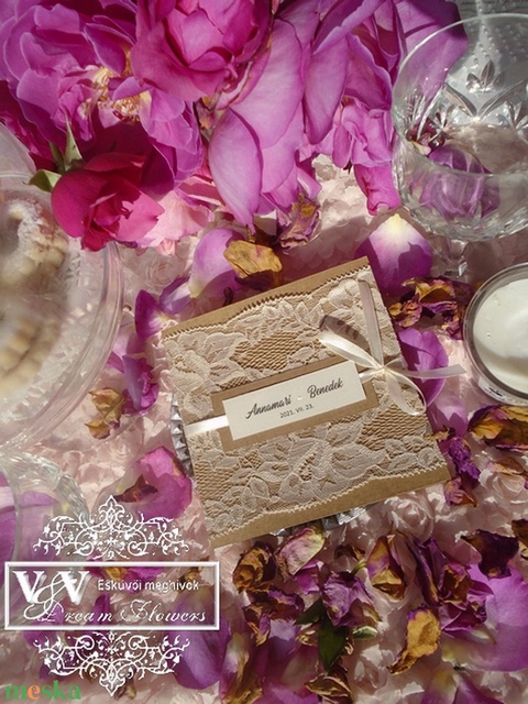 Csipkés esküvői meghívó natur és csillogó ekrü kartonból