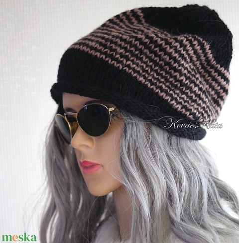 BEANIE LUX - trendi kézzel kötött angora-merinó sapka / fekete+drapp