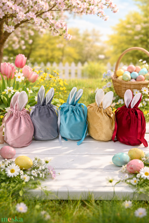 Bársony nyuszifüles zsák, tojásgyűjtő húsvéti szütyő, feliratos nyuszis húsvéti zsák gyerekeknek