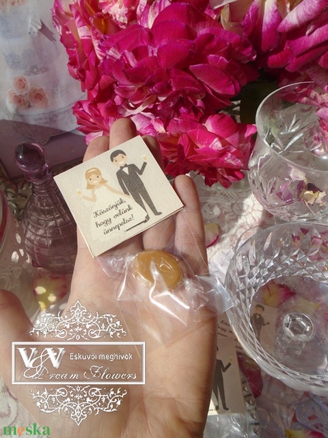 Esküvői köszönőajándék karamellás cukorka dísztasakban