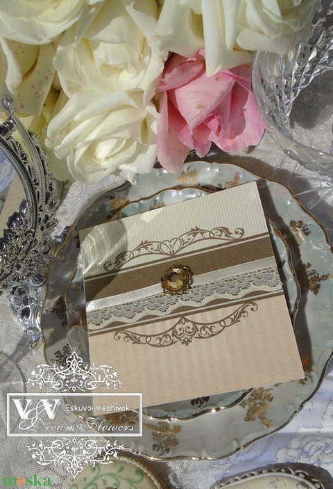 Csipkés esküvői meghívó barack barna és ekrü színben neobarokk stílusban