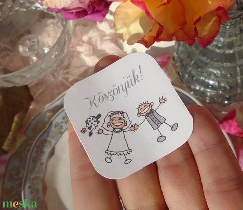 Esküvői köszönőajándékra öntapadós címke vidám pálcikaemberekkel
