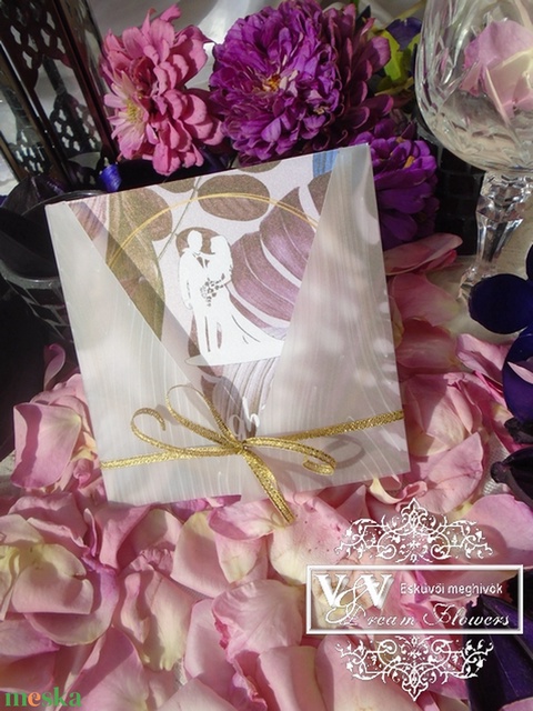Egyszerű kártyás esküvői meghívó lila trópusi levelekkel és nászajándék ötlet kártyával