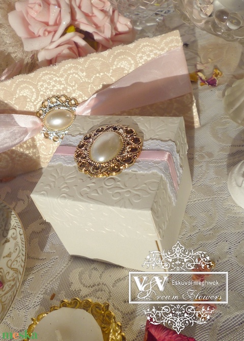 Dobozos esküvői meghívó barokk stílusban ekrü színben