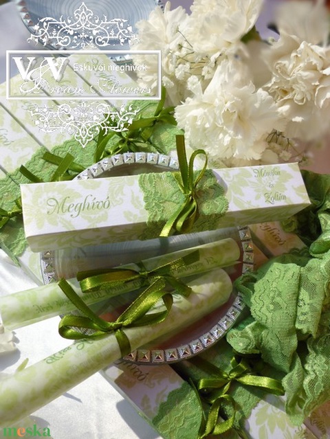 Dobozos pausz tekercses esküvői meghívó zöld csipkével díszítve