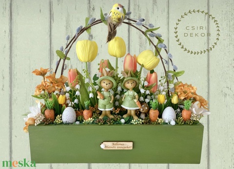 - Anyaga: fa láda, tartós virágok, polyresin figura, izlandi zuzmó, tartós zöldek