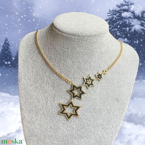 Aranyló Csillaghullás - kézzel gyöngyfűzött, elegáns nyaklánc, egyedi, növekvő csillag formák, időtlen fekete-arany szín
