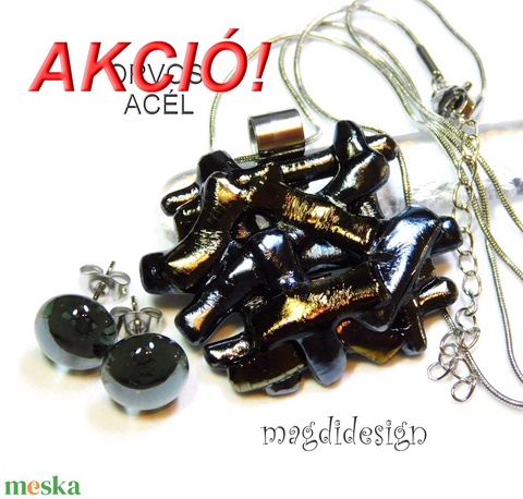 Ezüst-arany borzaska eozin üvegékszer szett, nyaklánc, pötty fülbevaló