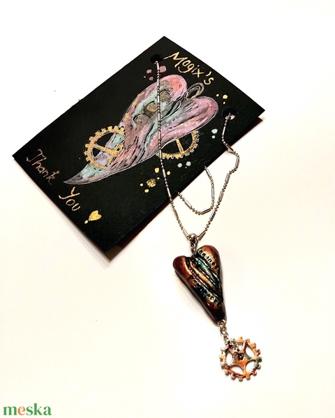 - Anyaga: ékszergyurma (polymer clay), medálvezető, lánc, szerelékek, lakk, metál akvarellfesték, nemesacél fogaskerék