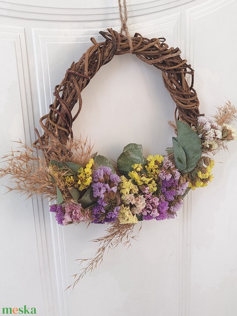 Színes szárazvirágos ajtódísz - koszorú szárított virágokkal - tavaszi kopogtató igazi növényekkel