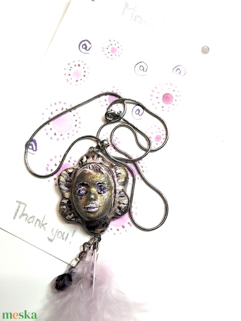 "Napfivér" Karnevál medál ékszergyurmából marabutollal, félhosszú kígyóláncon, kézzel festett köszönőkártyával