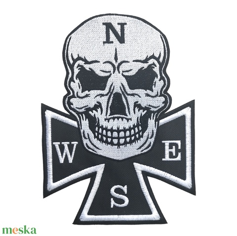 Vasalható varrható hímzett nagy felvarró Koponya vaskereszt égtájakkal hátfelvarró motorosfelvarró 21x15cm