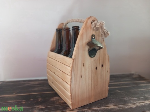 Sörös rekesz hordó alakú 6db 0,5l sörnek, sörnyitóval, kötél fogantyúval