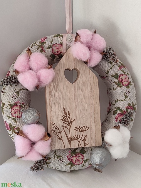 Tavaszi házikós ajtódísz - tavaszi koszorú fa házikóval - tavaszi virágos kopogtató termésekkel gyapottal