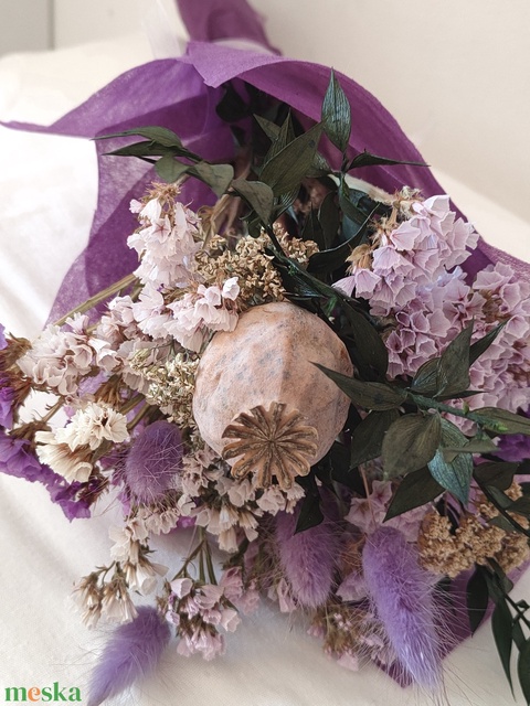 Szárazvirágos csokor lila rózsaszín - tavaszi virágcsokor - igazi növényekkel - valódi szárított virág