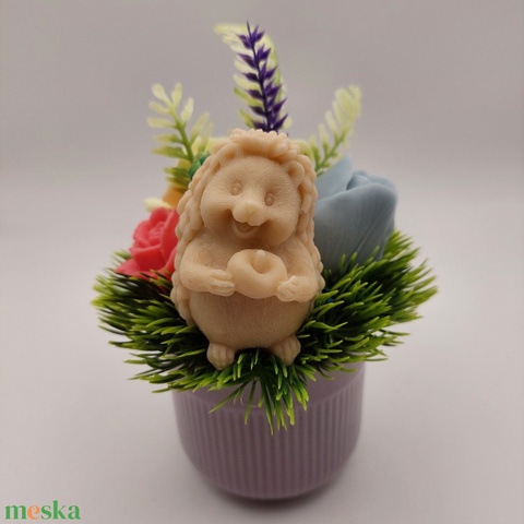 Szappanvirágok sünivel lila kaspóban