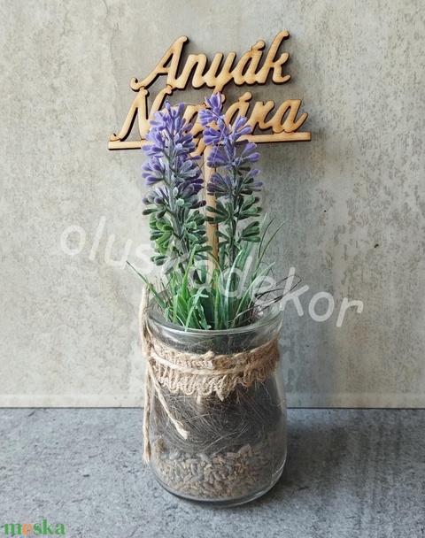Levendula, gumi, real-touch, műnövény üvegvázában, 13cm, táblával